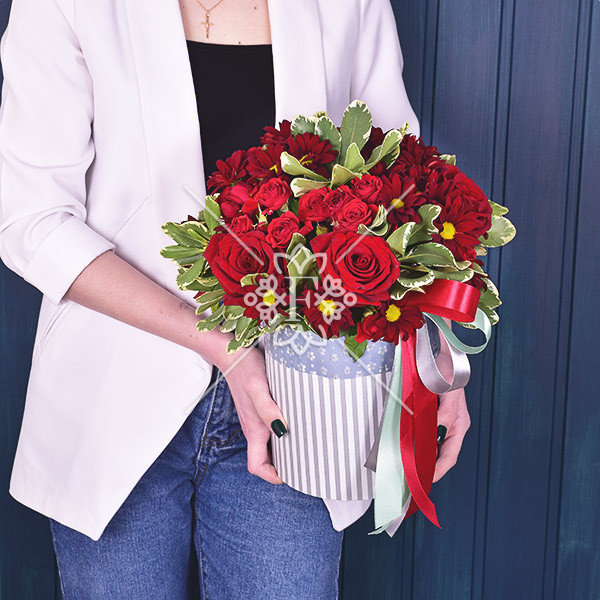 роза красная – 5 шт., роза красная кустовая – 4 шт., хризантема красная кустовая – 4 шт., зелень декоративная: питтоспорум, оазис, коробка, лента.