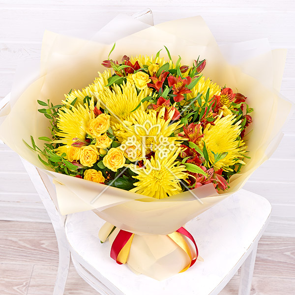 Лучики тепла – букет из хризантем, кустовых роз и альстромерий
